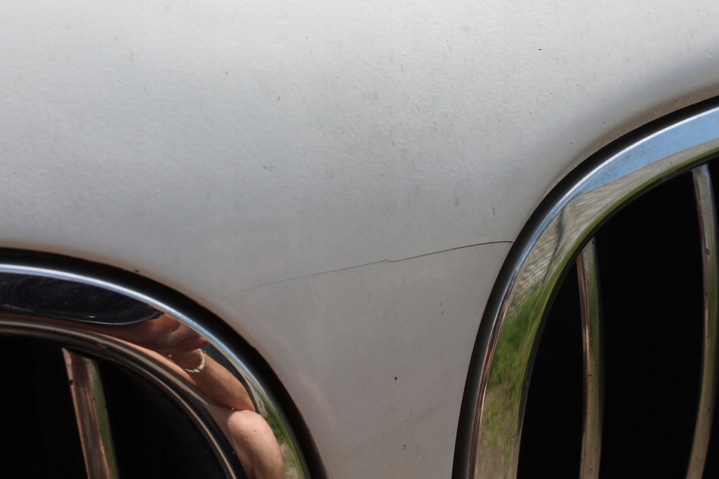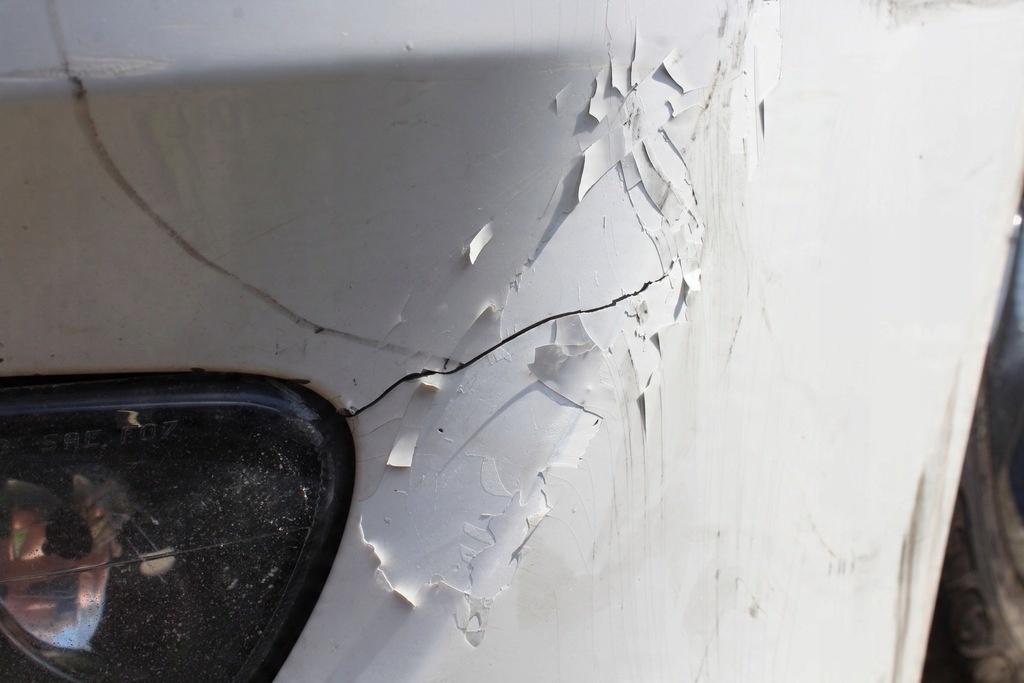 Skick: Sprucken färg, nagg, repor, skadade fästelement, sprucken stötfångare.